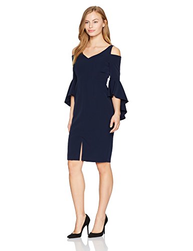 Dream crepe cocktail sheath with dramatic sleeves featuring cold shoulder and ruffle detail. The ultimate party dress and the perfect silhouette for the petite customerFeature