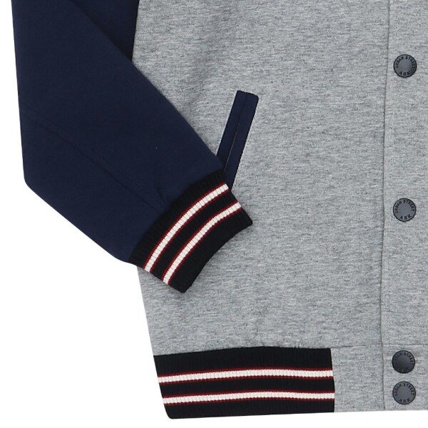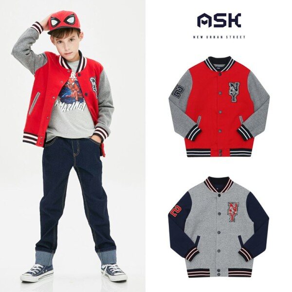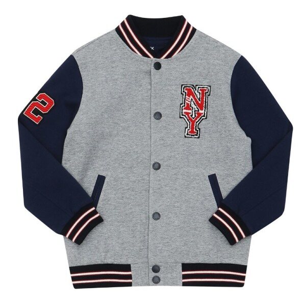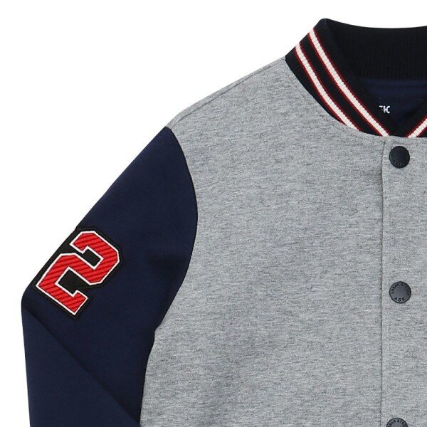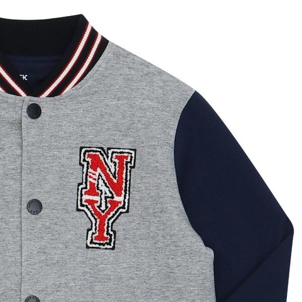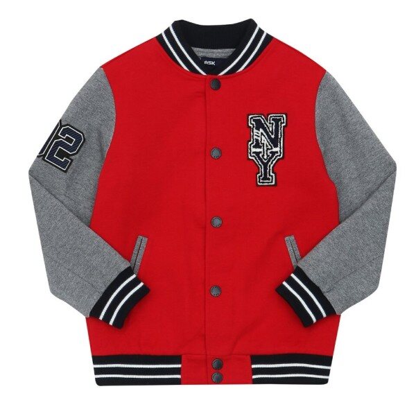 특양면 소재의 와펜 야구 점퍼.몸판과 소매 배색을 주고 가슴 부클 자수와 소매 자수 와펜으로 포인트를 준 유니 아이템.