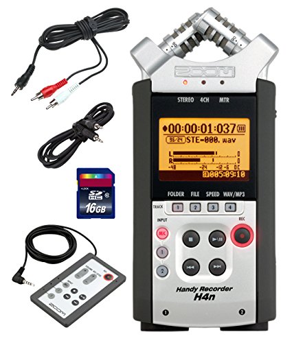 Zoom H4n Handy Mobile 4-Track Recorder - Bundle w/16GB Class 10 SDHC Card, Stereo 3.5mm Mini Phono Male to Two RCA Males Y-Cable, 3.5mm to 3.5mm Stereo Output Cable, Zoom RC-4 Remote Control