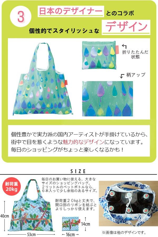 使わないときは折りたたんで収納できる、携帯に便利なショッピングエコバッグ。たっぷり容量で耐荷重はなんと20kg!!マチ付きにもでき、安定感も◎。日本のアーティストとコラボした個性豊かなデザインのDESIGNERS JAPANシリーズです♪