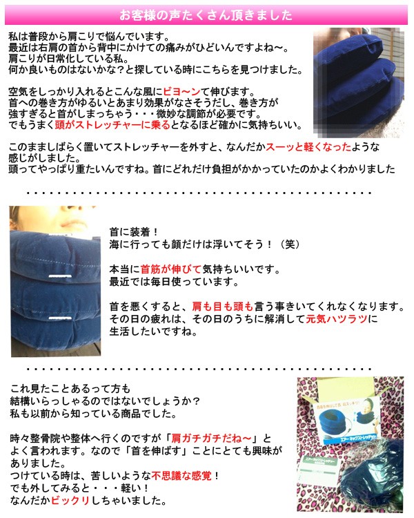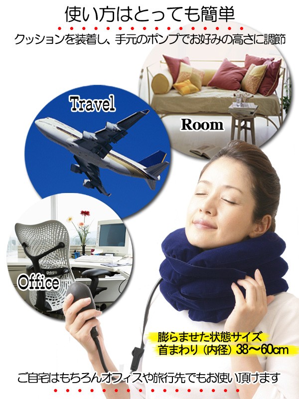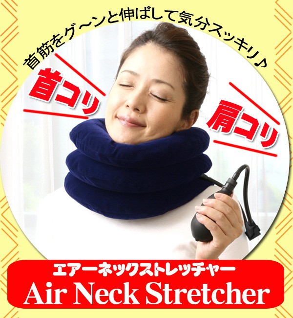 肩こり・首こりがつら~い!そんなお悩みのあなたに首筋のエアーストレッチはいかがでしょう。使い方はとってもカンタン。クッションを首に装着し、手元のポンプでお好みの高さに膨らませるだけ!エアーで優しく首筋を伸ばしていきます。手動ポンプで好みの高さに合せていけるので、体調にあわせてお使いいただけます。グーンと首筋が伸びて気分スッキリ。