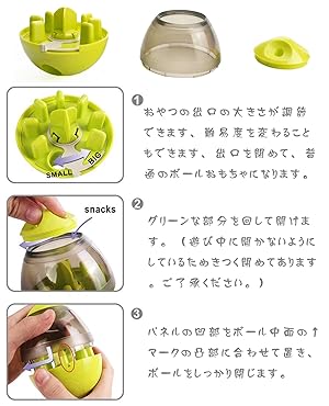 ・ボールの中にフードを入れて使います。猫犬は頭と体を使ってダルマボールをコロコロと転がさなければなりません。おやつの出口の大きさを調節し難易度も変えられます。出口が調節できるなので、多種類のおやつに適用です。出口を閉めて、普通のボールおもちゃになります。