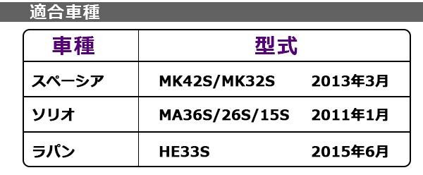 | 仕様 | 【適合車種】 スペーシア(MK42S/MK32S)2013年3月 ソリオ(MA36S/26S/15S)2011年1月 ラパン(HE33S)2015年6月 |