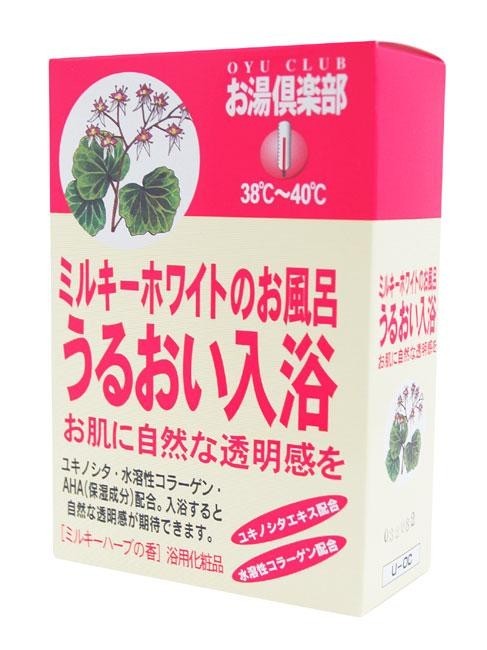 | ユキノシタ、水溶性コラーゲン、AHAなどの保湿剤を配合した入浴剤です。天然植物性酵素(パパイン)配合で、毛穴の汚れを落としつややかで透明感のある肌に導きます。きらめく雪のように白い湯色と、可憐で流麗なミルキーハーブの香りです。 |