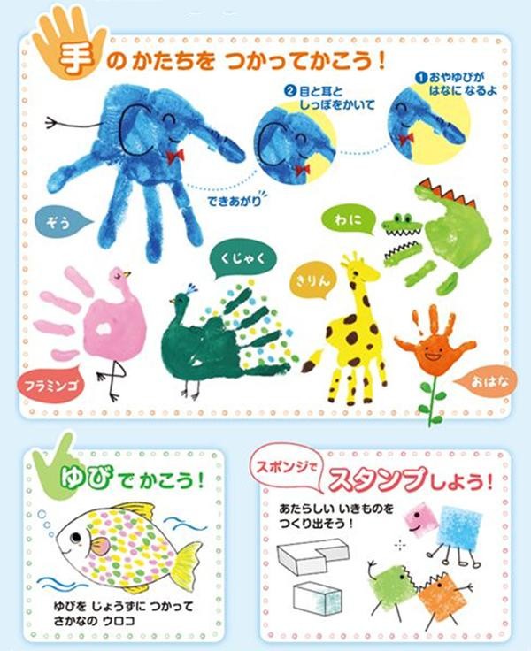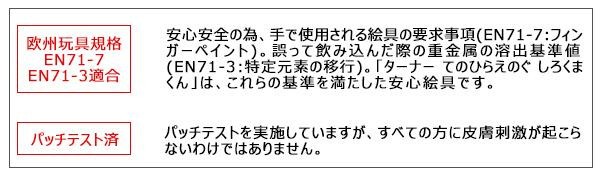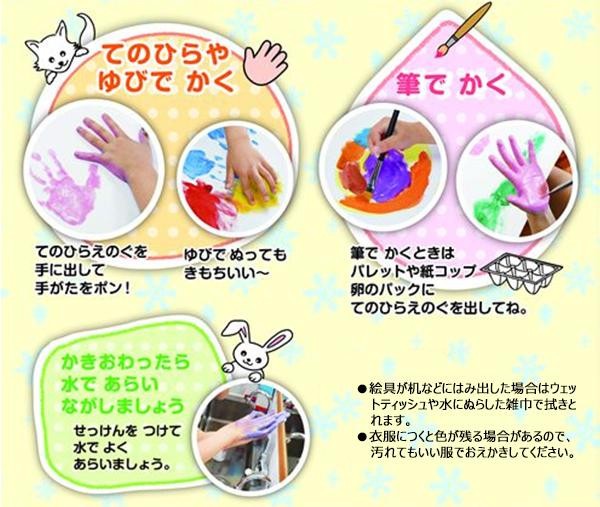手や指でそのまま描くことができます。手についた絵具は水やせっけんで洗うとおちます。