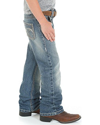 Rock 47 denim. Sits lower on waist, slim seat, thigh and knee. Boot cut.