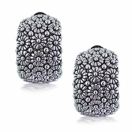 With a gracefully fresh yet retro feel, these wide, huggie hoop, clip on earrings are lovely for non - pierced ears. Accented by a lively, sunflower daisy pattern finished in rhodium plated brass, in a charming, antique style.