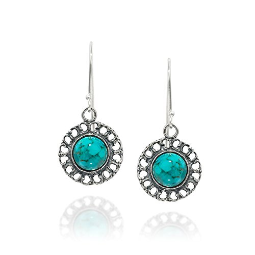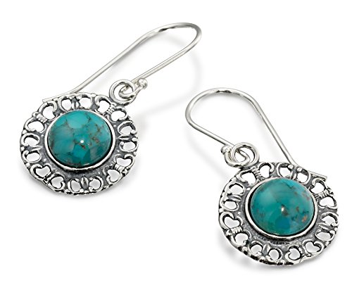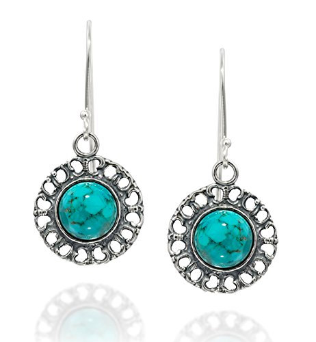 Elegant 925 Sterling Silver dangle filigree earrings with reconstituted Turquoise gemstone. An 8 mm round cabochon reconstituted Turquoise is inlaid in the center of this round shaped Sterling Silver dangle earring with filigree hearts design around the large Turquoise stone. Unique artisan design.