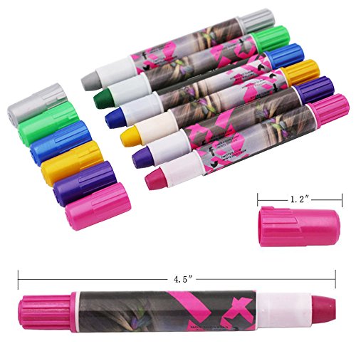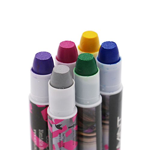 6 Hair chalk pens indcluded 6 bright colors: Silver, Yellow, Rose Red, Purple, Green, Blue; Metallic colors, glitter effect, shows nicely and shiny on all hair colors.