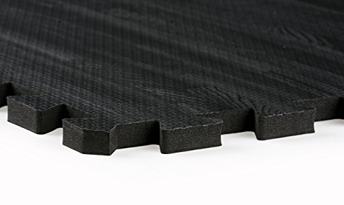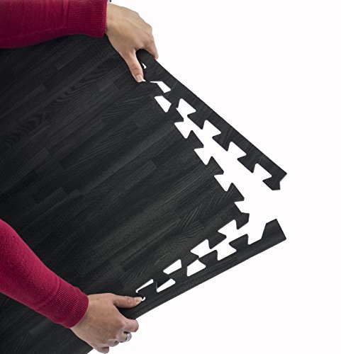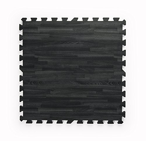 This black wood grain foam mat comes with 13 interlocking puzzle pieces. Each EVA foam tile is anti-fatigue, non-toxic, odor free, and stain resistant - making it great for use in daycares, playrooms, yoga studios, or even tradeshows. Connect 12 2'x2' tiles together (leaving 1 extra) to make a 6'x8' floor, or purchase 2 sets/26 pieces to create a 10'x10' mat area. Dimensions Per Piece: 24"w x 24"d x.5"h.
