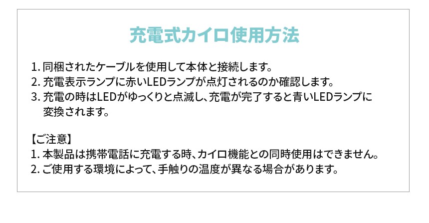 | 対応機種 | 1. 本製品は携帯電話に充電する時、カイロ機能との同時使用はできません。 2. ご使用する環境によって、手触りの温度が異なる場合があります。 |