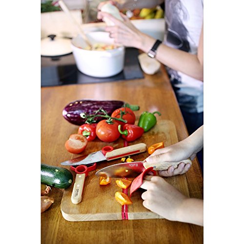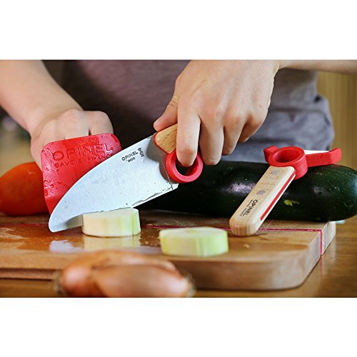 Knife has a rounded tip and an educational ring to help position the fingers and prevent the hand from slipping onto the blade