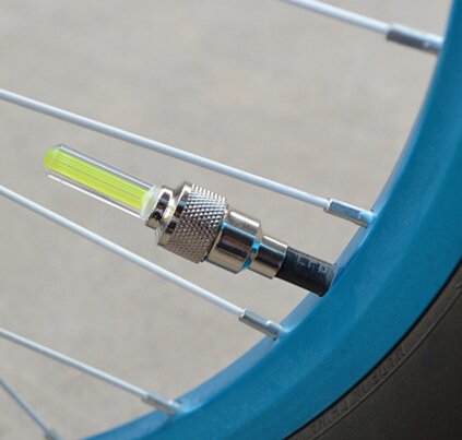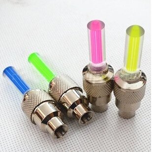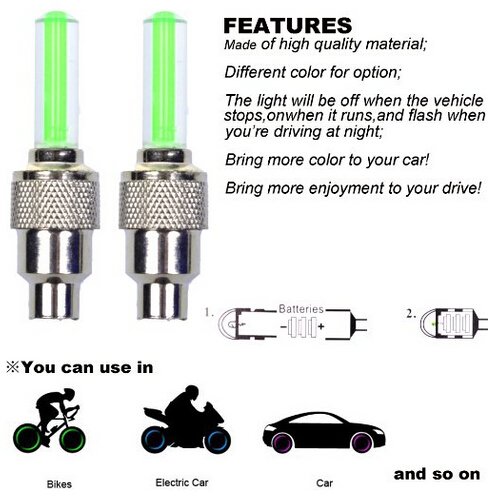 -. Feature : 100% Brand New & high quality / Material: Stainless steel & Plastic; quantity: 8 x wheel LED light / Devised ingenious design, easy to use, suitable for bike, motorcycle, electromobile and car. Protecting the air faucet from blocking and flooding water / Power: operated on 3 pieces of button cell battery (included). Automatic: with light & vibrancy sensors, automatically light up ONLY when driving in dark, and off when parking and in daytime / Fast & easy installation: fits for most valve, simply screw on your tire valve stem, direct bolt-on