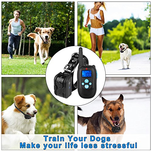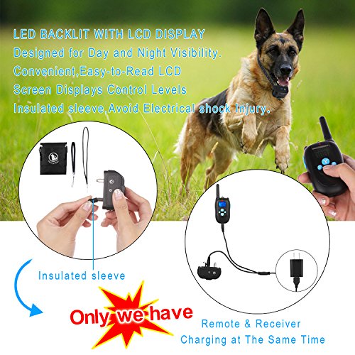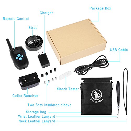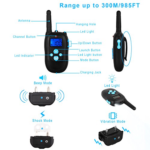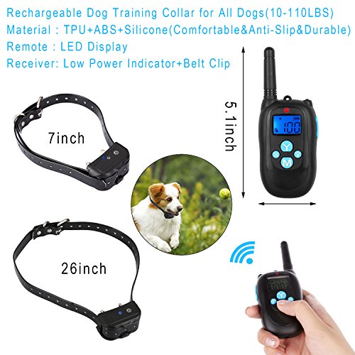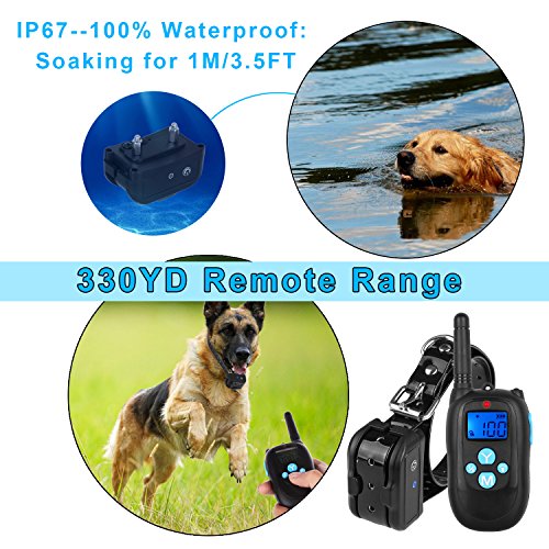 Specifications: Material: ABS PC Range: 330 Yards Color: Black Voltage: 5V Charging time: 2-3 hours Training Modes: Shock/Vibration/Beep Features 1.This training dog collars is able to fit small, medium and large dogs. It's perfect for dogs over 10 lb. Durable and adjustable TPU Collar length size from 7 to 26 inch long. 2. Package includes 1 collar and 1 remote. 1 Remote Transmitter can control up to 2 collars. (Extra collars need be bought separately). 3.Rechargeable Lithium Batteries for Receiver and Transmitter which can be charged at the same time. 4.Water Capabilities: Water Resistant Collar Receiver,up to IP67,your dog can swim in the water(1M). 5.Tone/Vibration Options: 100 Levels of Vibration and 1 Level of Standard Tone. 6.Comfortable Anti-Slip Durable:Silicone Button Belt Clip. 7.Stimulation Levels: 100 Levels of Static Shock. 8.Power saving design with Automatic Standby and Memory Function. 9.Led Light Mode to assist seeing dog in low light conditions. 10.Easy to operate and ergonomic Transmitter. 11.Effective and safe training system with Auto-Protect Mode. 12.LCD Display featuring a Blue Back Light for nighttime usage. 13.Quick and straightforward pairing process. Package Include: - 1 x Remote - 1 x Receiver - 1 x TPU Belt - 1 x Charging Cable - 1 x Charger - 1 x Test Bulb - 4 x Insulated sleeve - 1 x Storage bag - 2 x Leather Lanyard - 1 x Package Box Note: 1. Avoid leaving the remote shock collar on the dog for more than 12 hours per day. 2. Never connect a lead to the electronic collar; it will cause excessive pressure on the contacts.when you training,please put on two sets Insulated sleeves which can avoid electrical shock injury. 0