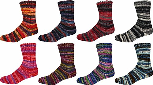 Virgin Superwash Wool 75% and Polyamide 25%. 8 -Ply. Stitch gauge 20 stitches on US 5 to 7 needles makes this a #4 Medium Worsted yarn, heavier and thicker than your standard sock yarn, makes a nice thick pair.