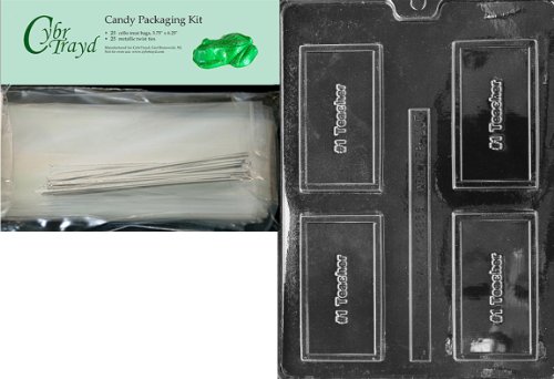 Cybrtrayd "No.1 Teacher" Business Card Chocolate Candy Mold with Packaging Bundle of 25 Cello Bags, 25 Silver Twist Ties and Chocolate Molding Instructions