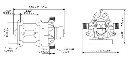 -. Feature : On-demand, automatic water pump for small boats, campers and / Built-in 45 PSI(3.1 BAR) pressure switch for automatic stop/start / Self-P.R.Iming allows it to be mounted above tank; able to run dry / Built-in thermal protector; 1/2"-14 MNPT Ports; 2-Pin/Leads Wire Connections / 2.8 gallons per minute (10.6 liters per minute); 3.5 Max Amps