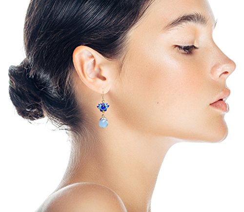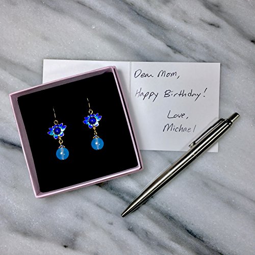-. Title : PRESIDENTS DAY SALE Peacock Blue Cloisonné Enamel Glazed Handcrafted Lotus Flower Unique Drop Earrings With Dangling Chalcedony Beads - BOX, CARD & ENVELOPE INCLUDED FOR EASY GIFTING