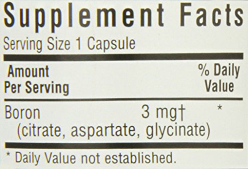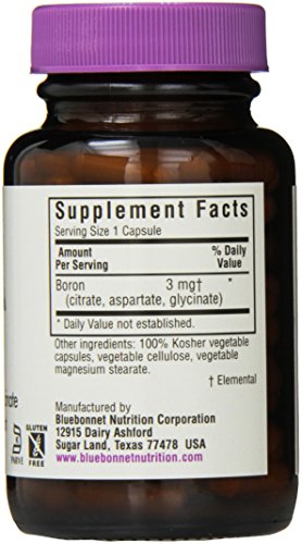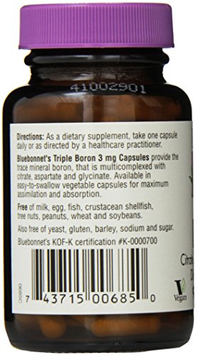 ReleaseDate : 2015-05-28 Studio : Blue Bonnet Publisher : Blue Bonnet Binding : Health and Beauty Product Description Bluebonnet's Triple Boron is used for building strong bones, treating osteoarthritis, as an acid for building muscles and increasing testosterone levels, and for improving thinking skills and muscle coordination. Bluebonnet's Triple Boron caosules provide the trace mineral boron, that is multicomplexed with citrate, aspartate, and glycinate. Available in easy-to-swallow vegetable capsules for maximum absorption and assimilation. 0
