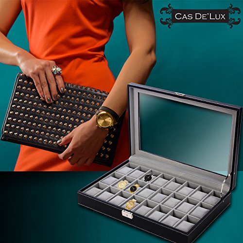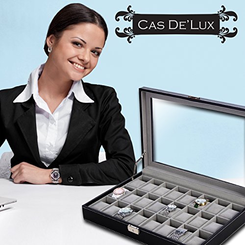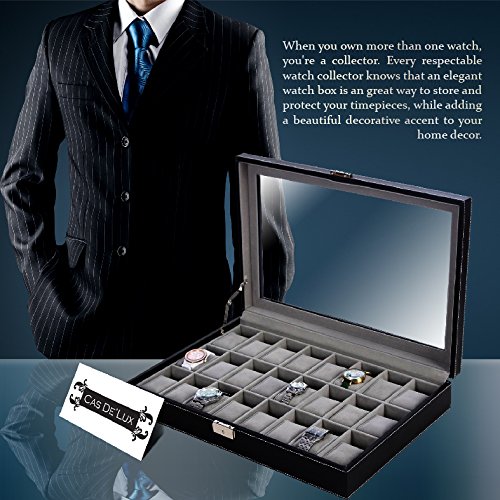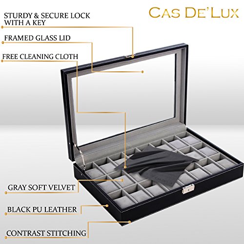 Luxury Watch Box 24 Velvet Pillow Slots, Premium Display Case With Framed Glass Lid, Elegant Contrast Stitching, Sturdy & Secure Lock - By Cas De` Lux