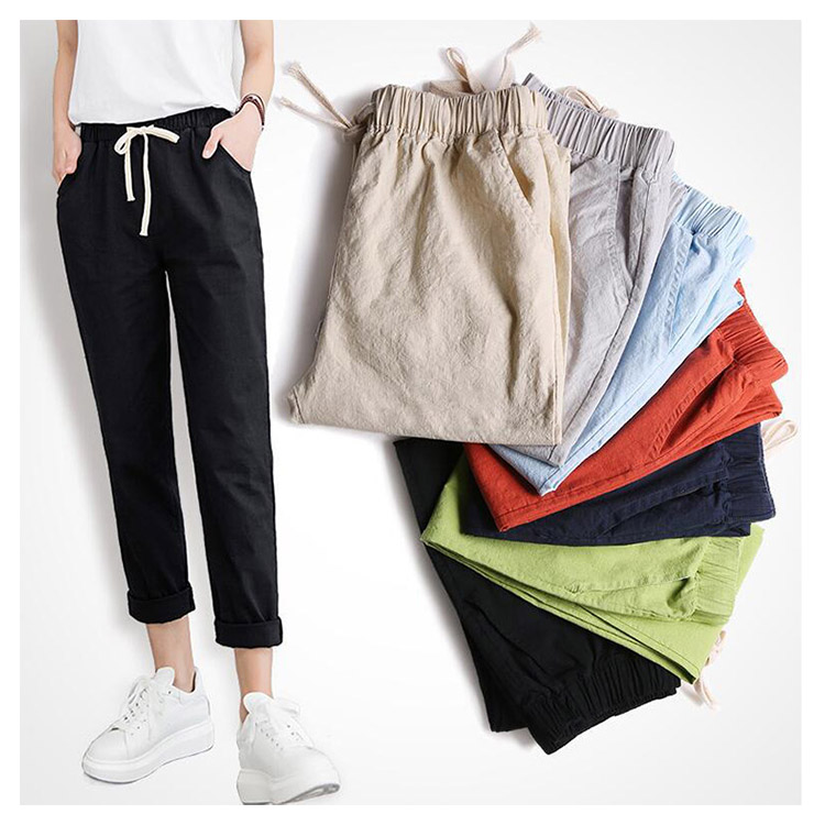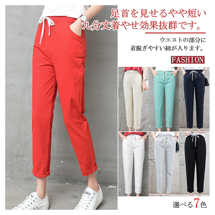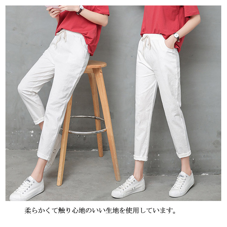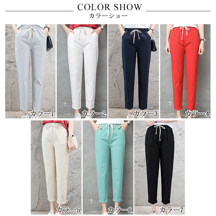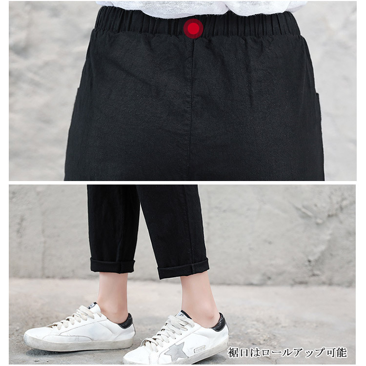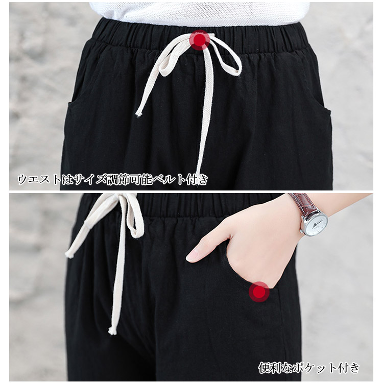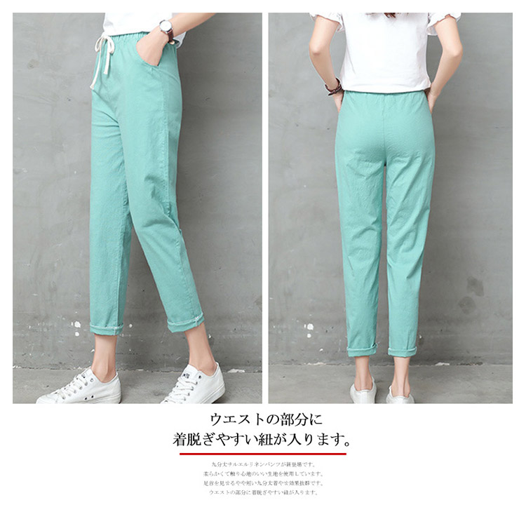 | 九分丈サルエルリネンパンツが新登場です。柔らかくて触り心地のいい生地を使用しています。足首を見せるやや短い九分丈着やせ効果抜群です。ウエストの部分に着脱ぎやすい紐が入ります。 | |