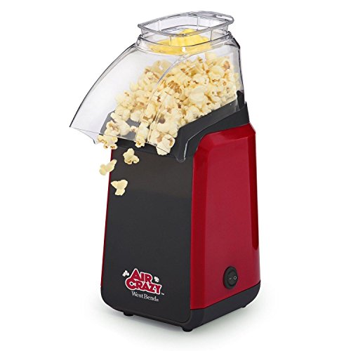 -. Brand : West Bend -. Color : Red and Black -. EAN : 0785983736824 -. Feature : Product Dimensions: 5.3 x 5.5 x 12 inches ; 2.2 pounds / Hot air popper pops faster than a microwave, up to 16 cups in less than 2 minutes / Cool touch base for added safety, easy to read ON/OFF switch and permanently attached cord that stores inside the unit for tangle-free storage / Improved chute design eliminates release of unpopped kernels / Butter warmer on top duals as a measuring cup with single and family-size servings markings -. ProductGroup : Kitchen -. ProductTypeName : KITCHEN -. Size : up to 16 cups corn -. Title : West Bend 82418R Air Crazy Hot Air Popcorn Popper -. UPC : 785983736824