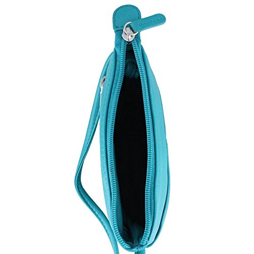 -. Feature : Material is leather / Measures 7.5 x 6 x 1.25 inches / Adjustable shoulder strap / Zipper closure main compartment with front slip pocket and back zipper pocket / Interior has zipper pockets