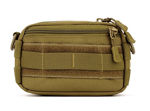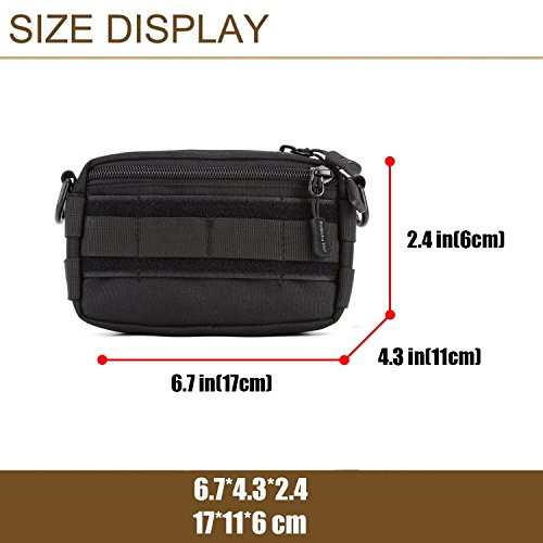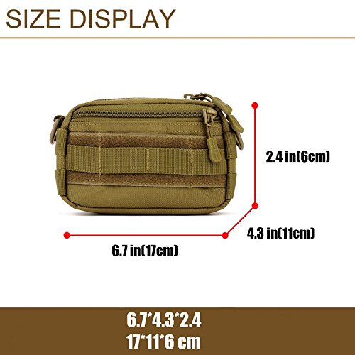 -. Feature : Dimensions: 6.69" W x 4.33" H x 2.36" D,High-intensity military-style / Made of tough and durable 1000 denier cordura nylon, functional design. Suitable for Trekking, Hiking Climbing, Campers and other outdoor activities. / Main pocket can fit well with 5.5" phone, cigarette box, tissue and so on. / MOLLE external expansion system designed to be used in combination with other equipment, you can load pockets, water bottle bag, accessory kits and other. / Adjustable and detachable shoulder strap, easy to adjust to your ideal style. Strong webbing belt loop on rear, deadly hard wearing & heavy duty.