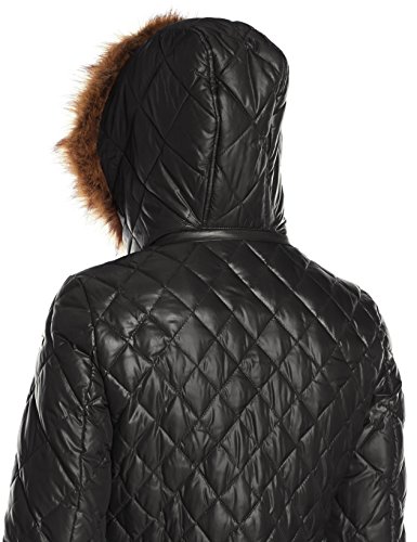 Diamond-quilted coat featuring front zipper with snap placket cover and detachable hood with faux fur trim