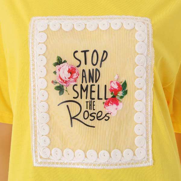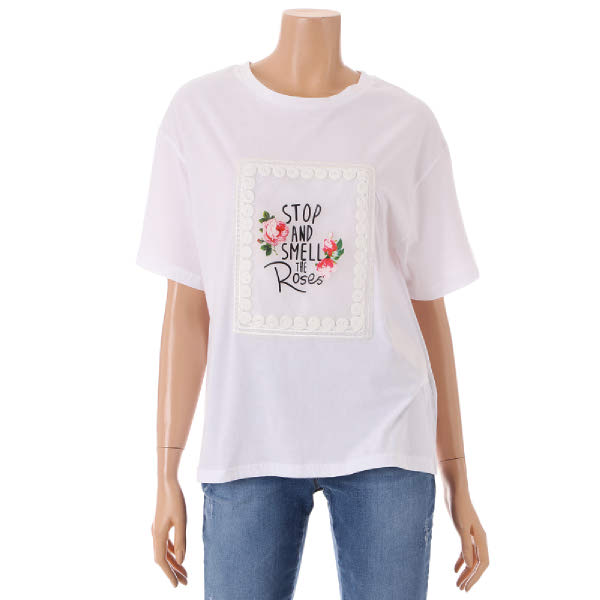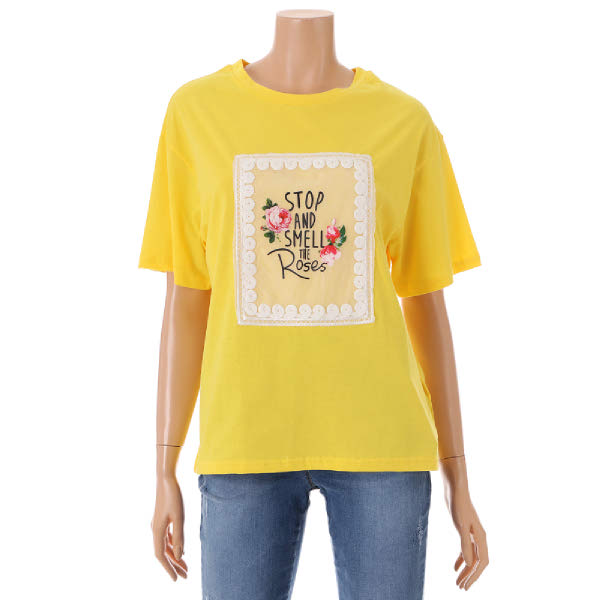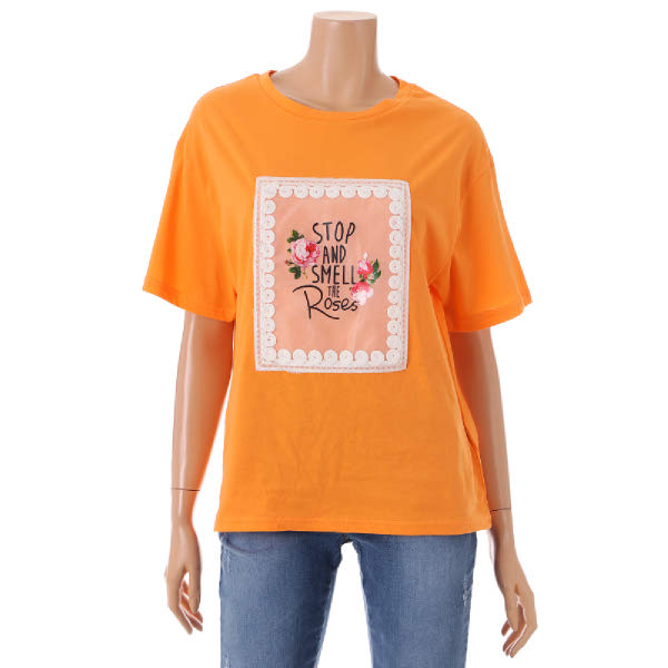 기본티셔츠입니다. 스판성있는 원단감과 앞판 꽃프린팅으로 편하면서 러블리하게 입으시기 좋습니다.