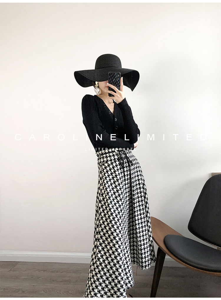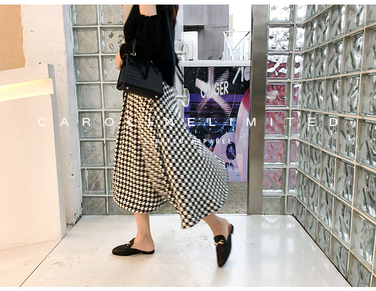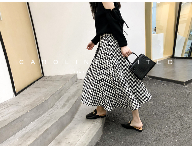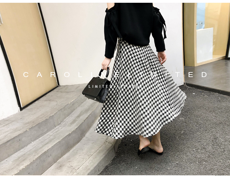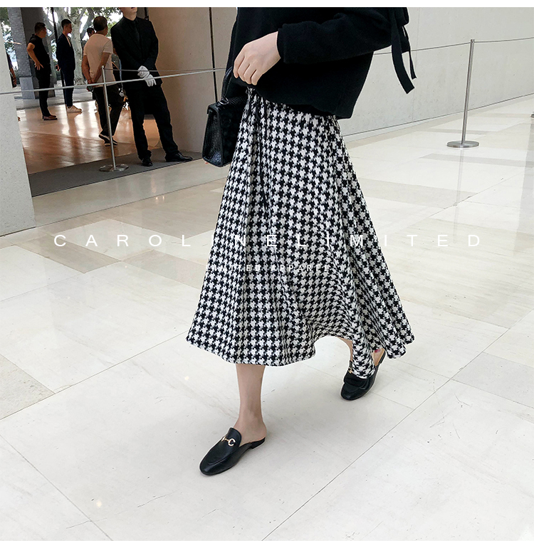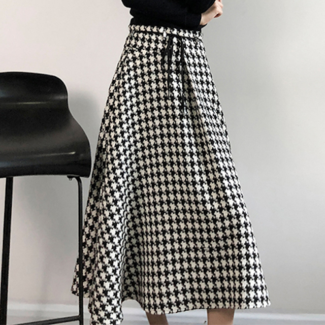 モノトーンの千鳥格子が大人っぽく落ち着いた雰囲気のロング丈フレアスカートです。