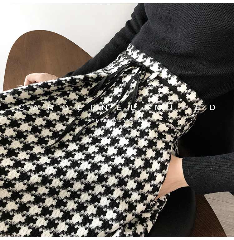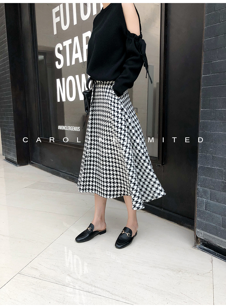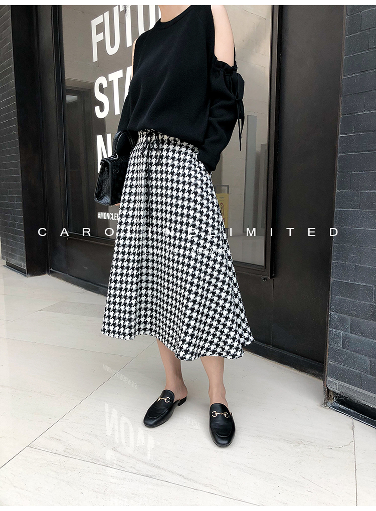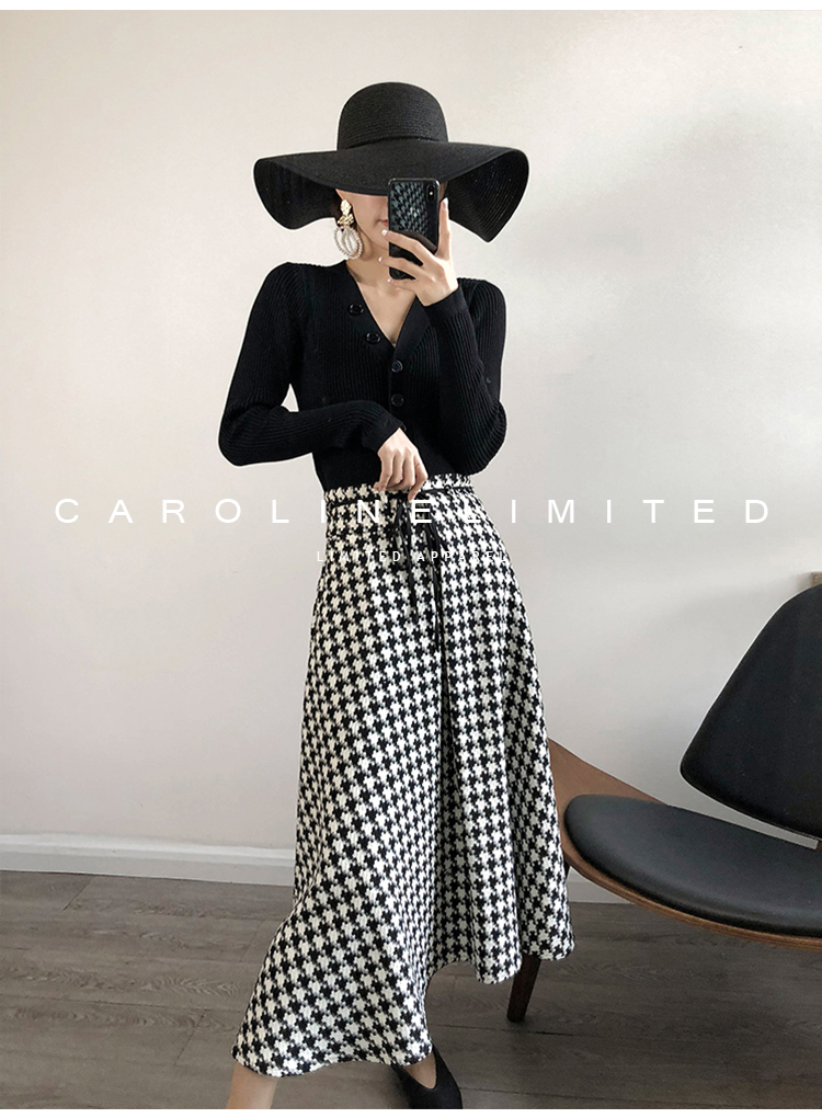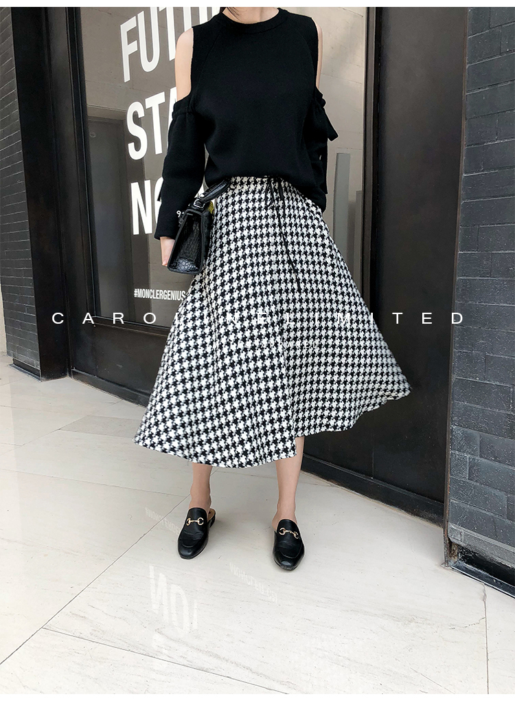 モノトーンの千鳥格子が大人っぽく落ち着いた雰囲気のロング丈フレアスカートです。