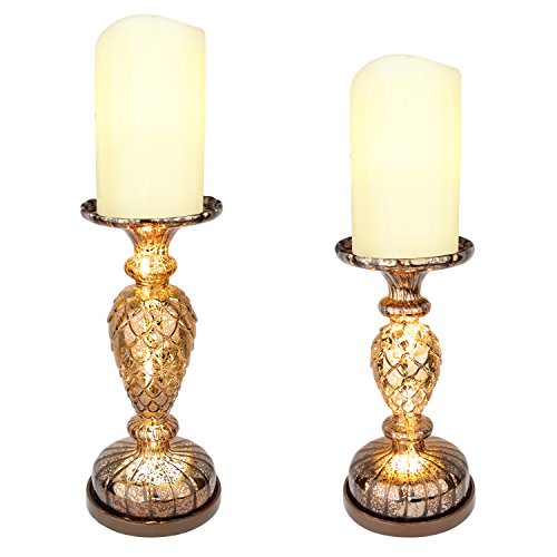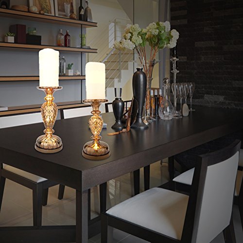 Studio : Runflory Publisher : Runflory Binding : Kitchen Product Description This impressive set comes with 2 mercury glass candle holders, they not only brighten the atmosphere, but also adds the perfect touch of timeless classic style to any room, it's truely a stylish way to accent a room, from the gentle curves of the glass to the fabulous iridescent mercury, One tall, one short, each holds one pillar candle (not included) - Add instant warmth and ambiance, the fluted appearances give an expensive and classy look to your room -- not only looks elegant, but also creates a warm atmosphere to stay with ●Effortless Elegance Done in varying heights and designs, each of these mercury glass pedestals looks lovely as it lights up, perfect as candleholders for your pillar or flameless candles, or even to display your favorite decorations with the endless options ● Excellent Reflect Design Ribbed mercury glass stem and smooth plate on top will suit a variety of home settings, and the candle light will bounce off the ribbed sides in all directions to make a lovely statement look ● Unique Mercury Glass Design Quality mercury glass materials with iconic retro design can show your house ingenuity decorating style, creates a dramatic centerpiece and instant ambience for any events ● Adjustable Three Lighting Modes Our pillar holder builts with 3 LED lights inside, there are 3 adjustable lighting modes to custom your needs, you can keep it on or off all the time, and also 5 hr. on/19 hr. off timer Main Features: Battery Powered Built-in LED Lights Mercury Glass Design Adjustable Lighting Modes Home Decor Accessories Details - Tall Holder: Plate Diameter: 3.94", Length: 12.13", W-Base: 4.92", W-Top:4.72" - Short Holder: Plate Diameter: 3.94", Length: 9.05", W-Base: 4.92", W-Top:4.72" What's In Boxes Set of 2 Candle Holder Pedestals 0