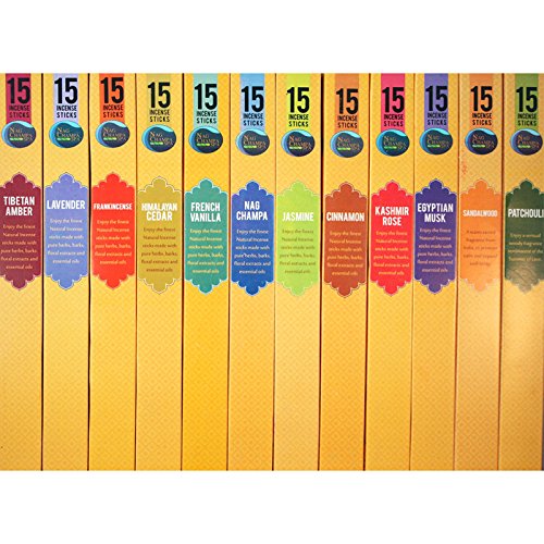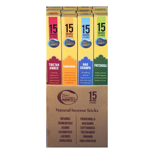 Nag Champa Spa Incense Popular Fragrances Sampler - 12 Boxes (15 Sticks Ea) Nag Champa, Sandalwood, Patchouli, Lavender, Jasmine, Frankincense, Himalayan Cedar, French Vanilla, Egyptian Musk, Kashmir Rose & Cinnamon