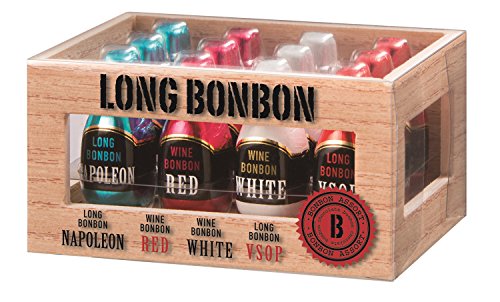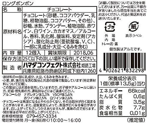 原材料:チョコレート(砂糖、ココアパウダー、乳糖、植物油脂、ココアバター、その他)、砂糖、水飴、ブランデー、植物油脂、赤ワイン、白ワイン、カカオマス/アルコール、香料、乳化剤、酸味料、安定剤(アラビアガム)、酸化防止剤(亜硫酸塩、V.C)、(一部に乳成分・大豆・くるみを含む)
