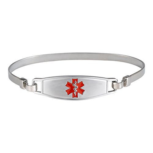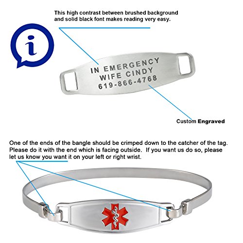-. Binding : Jewelry -. Brand : Divoti -. Department : womens -. Feature : Easily provide your custom engraved content by selecting the CUSTOMIZE NOW button to the right. UPDATE: One of the ends of the bangle should be crimped down to the catcher of the tag. Please do it with the end which is facing outside. If you want us do so, please let us know you want it on your left or right wrist. / Custom engraved in high contrast black laser engraving to personalize your medical message (3 lines of 18 characters, spaces included ) / Hypoallergenic (100% nickel free) pure tianium medical alert bracelet with size options 7.0-8.0 inches. / Deep embossed caduceus symbol with hard enamel symbol on the front of medical alert bracelet. Excellent wear resistance. / Includes free customizable medical alert wallet card, medical alert smartphone apps and Velvet gift bag. -. Label : Divoti Inc. -. Manufacturer : Divoti Inc. -. Model : 5404RE -. MPN : 5404RE -. PartNumber : 5404RE -. ProductGroup : Jewelry -. ProductTypeName : FASHIONNECKLACEBRACELETANKLET -. Publisher : Divoti Inc. -. Studio : Divoti Inc. -. Title : Divoti Custom Engraved Simple Elegant Pure Titanium Medical Alert Bracelet - Bangle -Red