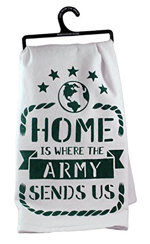 - Features the phrase "Home is where the army sends us" in green with stars and a globe as accents