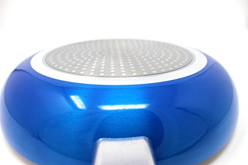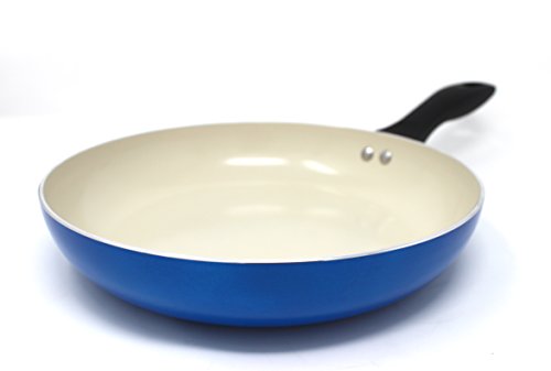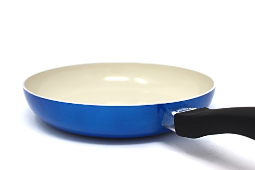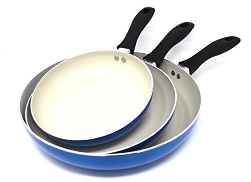 A 3 piece set of metallic red or metallic blue exterior frying pans with beautiful beige ceramic non stick interior. Set includes 8, 9.5, and 12".