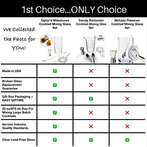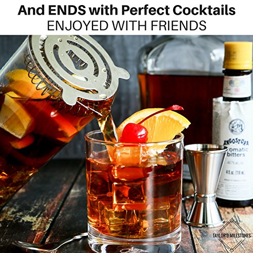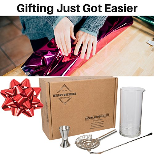 The Attraction of Our Bartender Set At Taylor'd Milestones we are committed to excellence, efficiency and happy customers. We believe there is so much joy to be had when you can be the bartender in your own home! You will be blown away with how much fun you can have with this set. We offer only premium quality products and outstanding customers service. You can trust that this Gift Set offers both! We are always available to assist with any questions or concerns you may have as you journey through becoming a master mixer! Are you looking for a thoughtful gift? Pair this kit with any of the Taylor'd Milestones Glass Sets and you have just created the perfect gift for someone on your list! Are You Ready to Start Mixing Professional Cocktails? Our deluxe 4 piece Bar Set includes all the tools you need to mix professional cocktails in the comfort of your home. This Cocktail Mixing Glass set includes: 1. 33 oz (975 ml) Cocktail Mixing Glass 2. 12" Stainless Steel Bar Spoon 3. 1 oz / .5 oz Stainless Steel Double Jigger 4. Stainless Steel Cocktail Strainer with Handle Keep All Your Bar Tools Handy and Accessible Our Mixing Glass doubles as the perfect storage place for your Bar Tools. The Bar Spoon, Double Jigger, and Cocktail Strainer conveniently fit inside the glass, keeping everything you need in one place. We LOVE to make things easy for you! Efficient Size Mixing Glass One of the top features of our Cocktail Mixing Set is our Premium Size Glass. The 33 oz (975 ml) mixing glass is perfect for mixing up a double or even triple size batch of your favorite cocktail. Now you can spend more time relaxing and enjoying your cocktail and less time mixing. You will love the advantage of using a glass this size! Our Mixing Sets are going fast at this price. Click the Add to Cart Button now. Experience the Quality 0 |