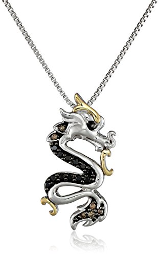 -. Binding : Jewelry -. Brand : Amazon Collection -. Department : womens -. EAN : 0696736376146 -. Feature : Necklace featuring daring dragon pendant with yellow gold accents and black and champagne diamonds / Box chain with sP.R.Ing-ring clasp / All our diamond suppliers confirm that they comply with the Kimberley Process to ensure that their diamonds are conflict free. / Imported / Carat weight listed is the total for all stones. -. Label : Amazon Curated Collection -. Manufacturer : Amazon Curated Collection -. Model : ESN5463MFCAM -. MPN : ESN5463MFCAM -. PartNumber : ESN5463MFCAM -. ProductGroup : Jewelry -. ProductTypeName : FINENECKLACEBRACELETANKLET -. Publisher : Amazon Curated Collection -. Studio : Amazon Curated Collection -. Title : Sterling Silver and 14k Yellow Gold Black and Champagne Diamond Dragon Pendant Necklace (1/7 cttw), 18" -. UPC : 696736376146