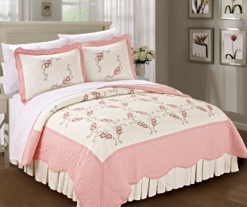Serenta Classic Embroidery Prewashed Pink Chrysanthemum Microfiber Bedspread Quilt Blanket 3 Pieces Bed Set (Queen), Light Pink