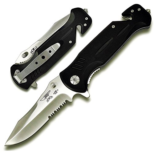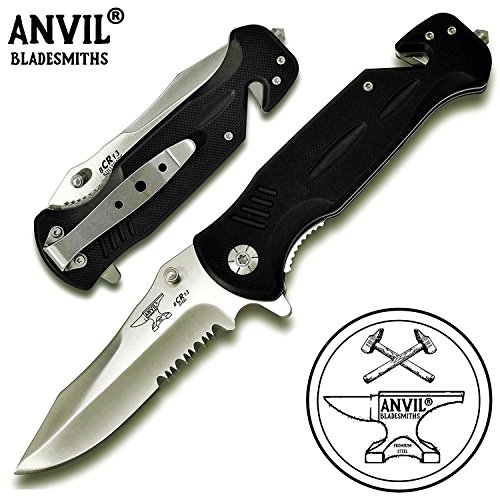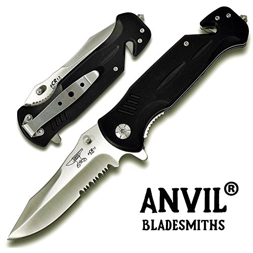 ANVIL BLADESMITHS - BULLSHARK G-10 8CR13 Folding Assisted Open Tactical Rescue Pocket Knife w/Glass Breaker and Seatbelt Paracord Cutter - Choice of SERRATED OR STRAIGHT Blade