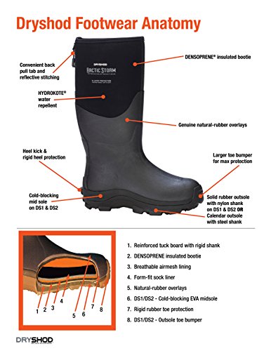 Studio : DRYSHOD Publisher : DRYSHOD Binding : Misc. Product Description Premium Outdoor Sport Boot. The high traction sole is ideal for outdoor work and play activitiesdont let mud or snow slow you down.DS1 molded outsole outer/high traction color-coordinatedEVA mid-sole for comfort and cold-blockRemovable molded EVA socklinerMOBU camo on upperNylon shankComfort Range -20F to 75F 0