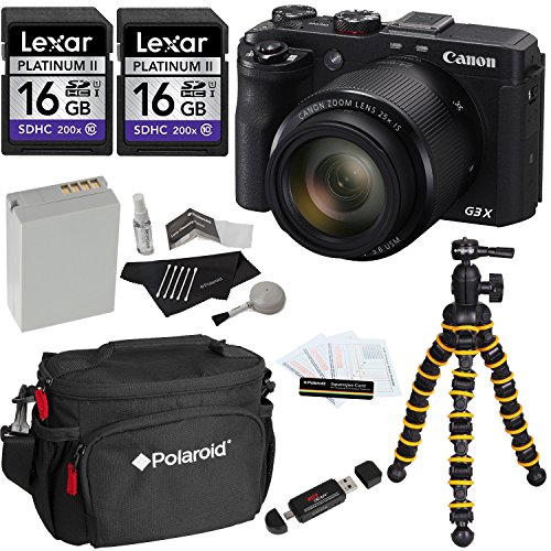 Canon PowerShot G3 X Digital Camera + Polaroid Snap and Wrap Flexi Tripod + Two Lexar 16GB SDHC 200X UHSI Class 10 + Polaroid Camera Bag + Spare Battery + Cleaning Kit + Card Reader + Screen Protector