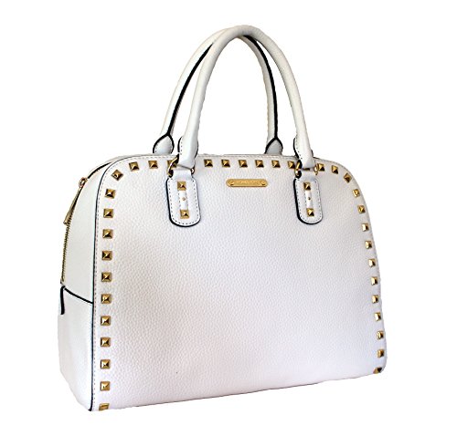 -. Brand : Michael Kors -. Color : Optic White -. Department : womens -. EAN : 0190049940136 -. Feature : Gorgeous white saffiano leather; gold hardware / 1 inside pocket, 4 slip pockets, protective feet at bottom / Dual rolled leather handles with 5" drop / Removable, adjustable shoulder strap with 20-26" drop / Measures 10" H x 5" W x 13" L -. ProductGroup : Shoes -. ProductTypeName : HANDBAG -. Size : Large -. Title : Michael Kors Sandrine Large Leather Stud Satchel Handbag -. UPC : 190049940136