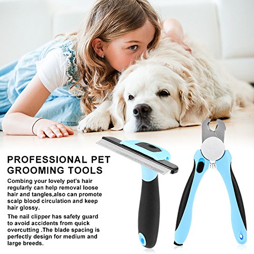 Features about the 2 in 1pet grooming kit: Pet nail clippers with a removable protective baffle for avoid overcutting; Embedded nail file ;Easily lock buttom of blade Pet grooming comb has a removable button for disassemble and install; More comfortable flat comb teeth Suggestion: regularly use the beauty care tools and can help to enhance trust and dependency pet for you. And benefiting the health of the family and your pets.