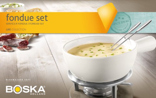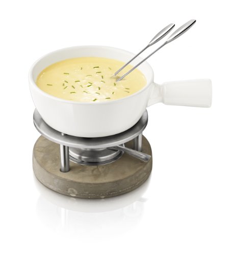 - Fondue set includes: white ceramic pot, concrete base, 4 stainless steel fondue forks, burner