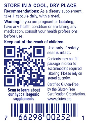 FREE FROM: At Pure Encapsulations, our product are free from wheat and gluten; egg; peanuts; coatings and shellacs; GMOs; magnesium stearate; trans fats and hydrogenated oils; artificial colors, flavors and sweeteners; unnecessary binders, fillers and preservatives. Any product containing ingredients derived from allergens, such as soy, dairy or shellfish, is clearly labeled. All two-piece capsules are hypoallergenic and vegetarian.