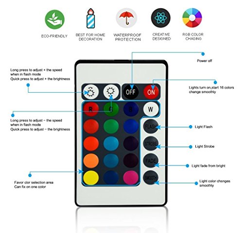 Features: It is very energy efficient, has a very long life and does not produce very much heat. Light output colors comes in 4 main RGB colors (Red, Green, Blue and White).Total 16 different color tones and 4 flash modes.