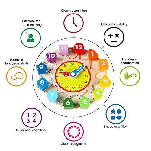 Wooden clock with 12 removable pieces for teaching 1-12 hours which fit into matching slots on the clock. Also can play building blocks, teaching time telling, number, color and shape